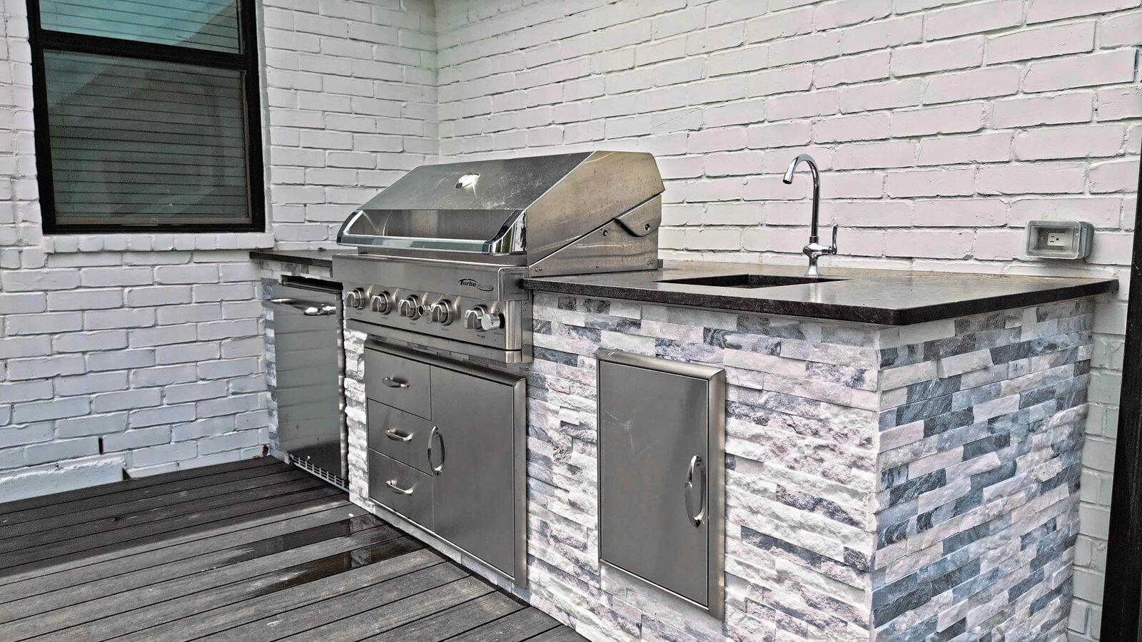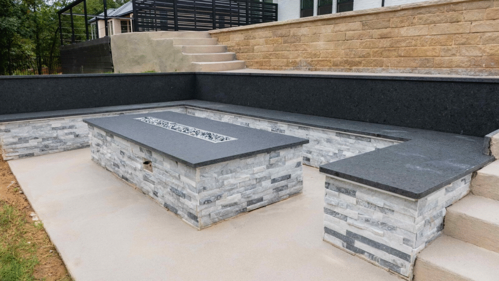 Our team designed and installed a fully equipped kitchen with durable surfaces and plenty of prep space. The firepit area was crafted to provide warmth and ambiance, making it a great spot for family and friends to come together. Every detail was planned to blend comfort and style, turning their backyard into a true outdoor retreat.